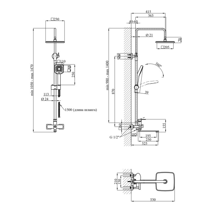 Висота душової стійки: Мінімальна – 980 мм, максимальна – 1400 мм.