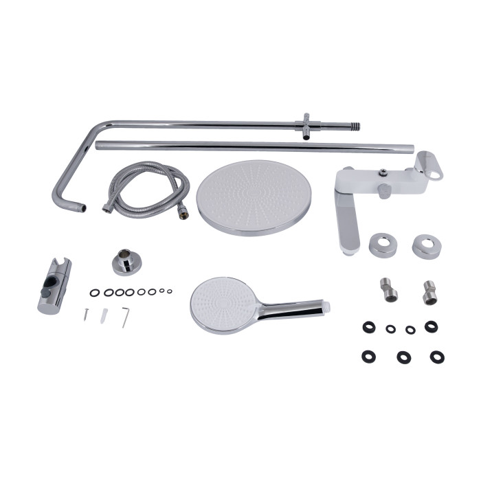 Змішувач, кронштейн для верхнього душу, лійка для верхнього душу, кронштейн для ручного душу, лійка для ручного душу, душовий шланг, шлангове з'єднання, кріплення.