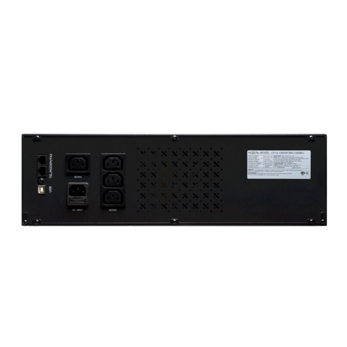 Джерело безперебійного живлення LP-UL1250VA RM (rack mounts) (with battery) (лінійно-інтерактивний тип) має показник потужності - 1250/720 VA/W і вхідну напругу - 220/230/240 ± 10% V. Захисний функціонал інтерактивного джерела безперебійного живлення LP-UL1250VA RM (rack mounts) (with battery) має наступні типи захисту: від короткого замикання, стрибків напруги, перевантаження, розряду і надлишкового заряду батарей. Автопідзарядка пристрою виконується у вимкненому стані. Має 2 євророзетки, функції холодного старту та повторного запуску при відновленні напруги в мережі. ДБЖ має технологію триступінчастої зарядки АКБ, що значно скорочує час перезарядки. Завдяки технології інтелектуального керування акумулятором його заряджання відбувається з урахуванням температурної компенсації, що збільшує термін служби акумулятора.
