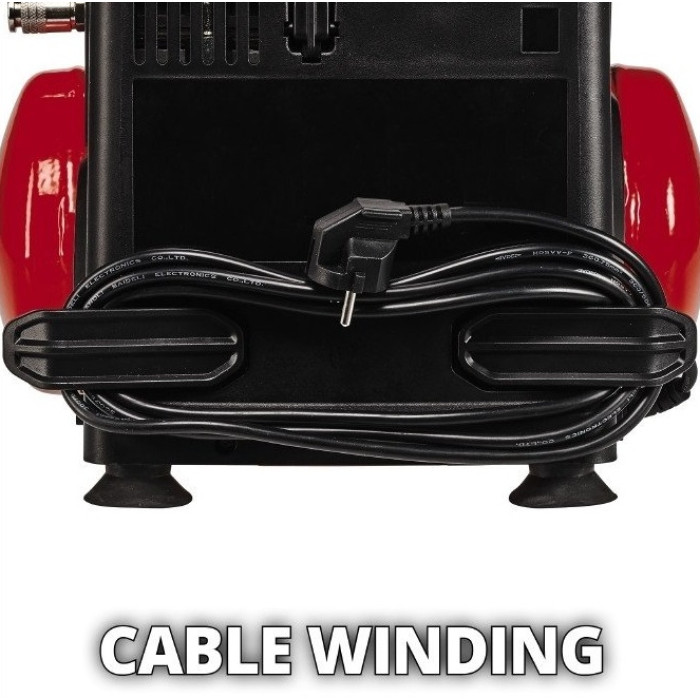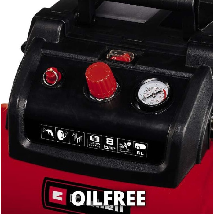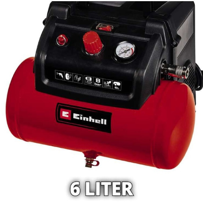 Завдяки цьому мобільному і компактному компресору Einhell TC-AC 190/6/8 OF ви можете виконувати безліч простих робіт, що вимагають стисненого повітря, в домашніх умовах, в саду і гаражі або в кемпінгу. Завдяки наявності ресивера зі стисненим повітрям 6 л невеликі роботи можуть бути виконані без нового запуску двигуна компресора. Завдяки використанню ідеально підігнаних компонентів безмасляний компресор Einhell TC-AC 190/6/8 OF працює повністю без масла, тому компресор не вимагає техобслуговування по контролю і доливці масла.