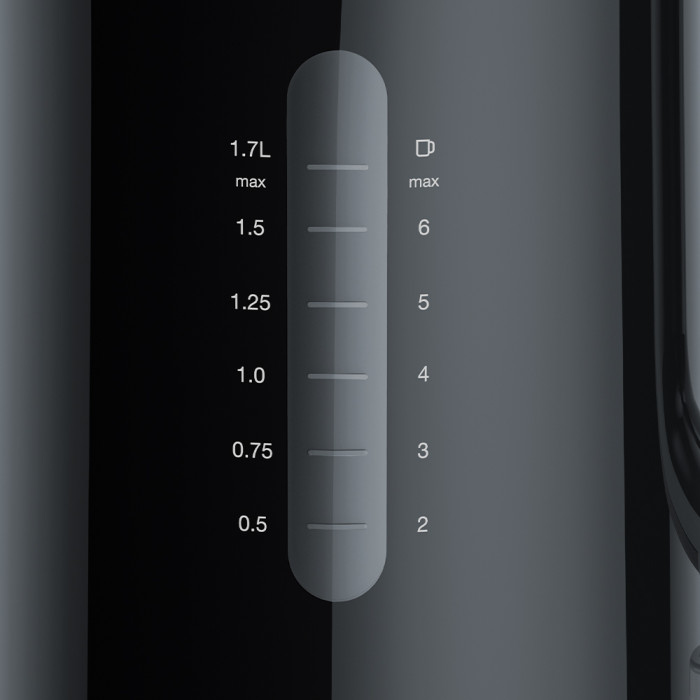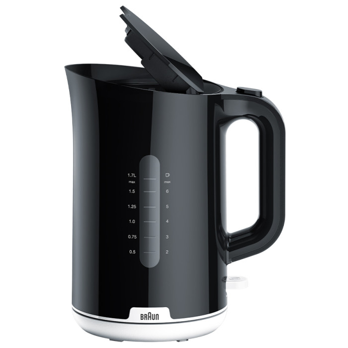 Обсяг чайника в 1,7 літрів, дозволяє закип’ятити рідина як для однієї людини, так і для цілої компанії, що б влаштувати повноцінне чаювання. Ергономічна, нековзна ручка зручно тримається в руці. Індикатор на бічній частині корпусу чайника Braun WK 1100 Black орієнтує про які залишилися об’ємі рідини. Варто відзначити так само дуже зручну поворотну основу. Завдяки її конструкції, ви можете ставити на неї чайник з будь-, зручною для вас позиції, що не переживаючи про правильність розміщення приладу для подальшого використання.
