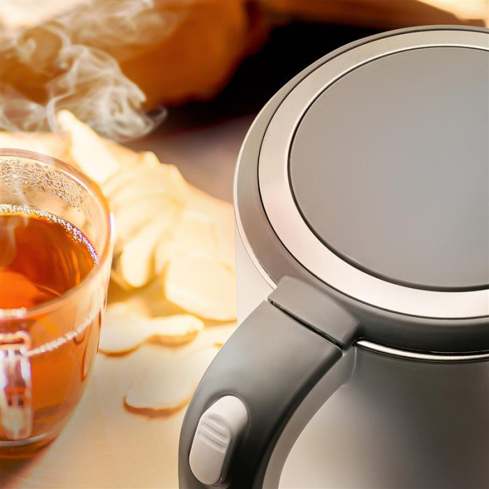 Модель має внутрішній резервуар для води, в який поміщається до 1700 мл. При цьому сам корпус зроблений так, щоб забезпечити повну безпеку користувачеві. Його подвійні стінки (метал всередині, пластик зовні) працюють за принципом термоса, утримуючи температуру всередині, а зовнішню частину залишаючи прохолодною. Так окріп набагато довше буде на потрібному рівні температури, а ви не ризикуєте отримати опік з необережності.