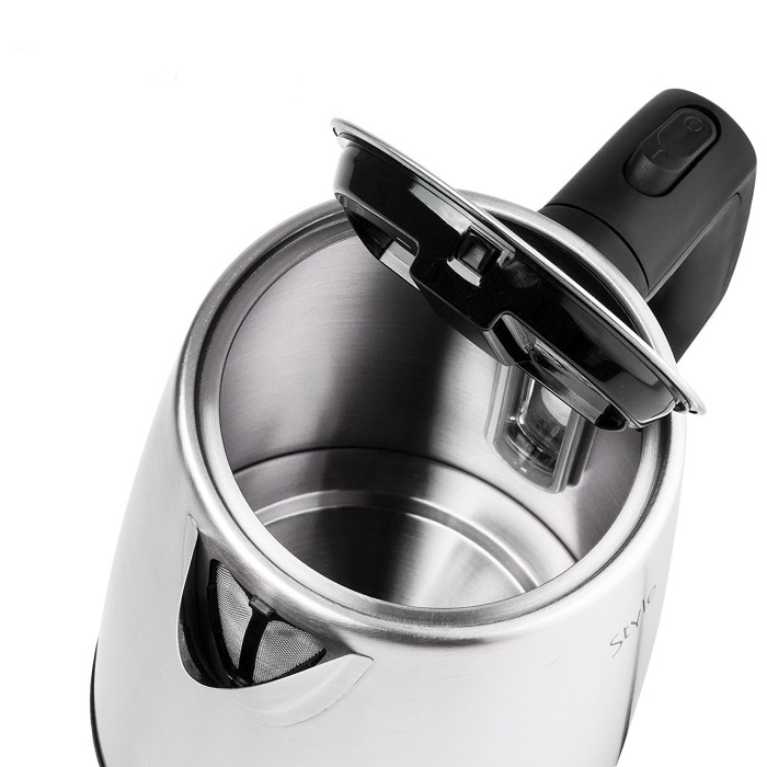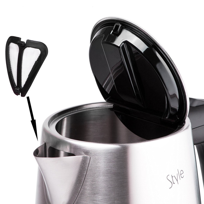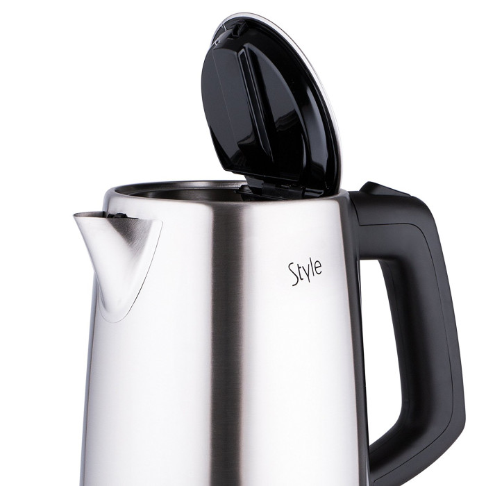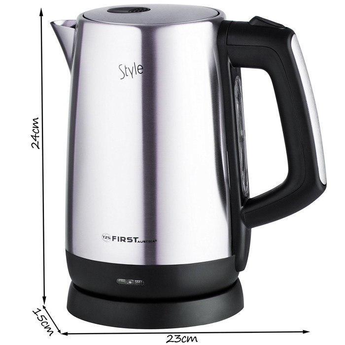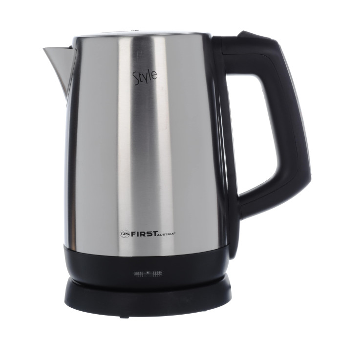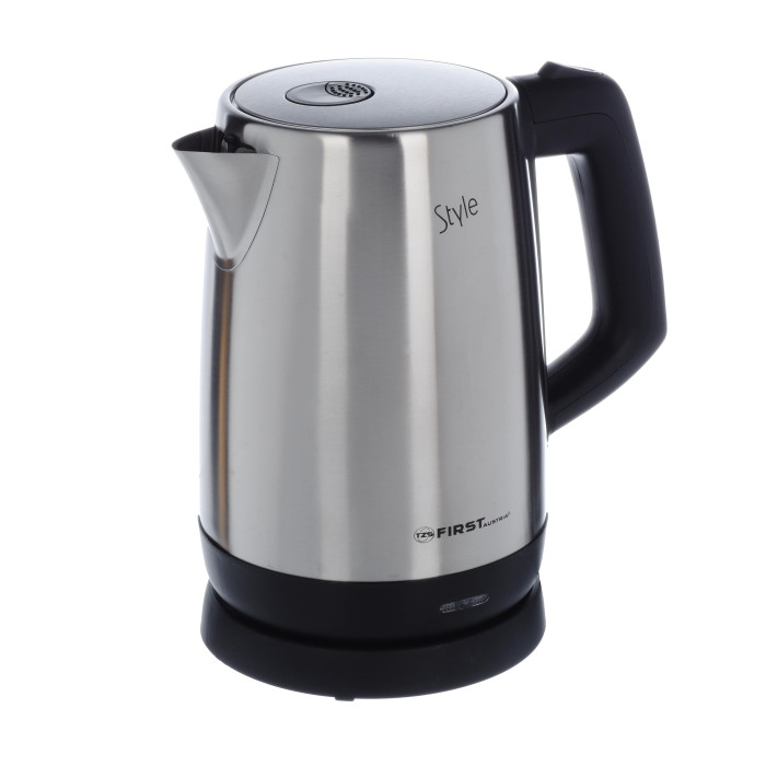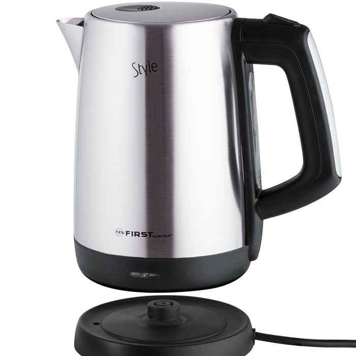 Корпус електрочайника First FA 5411-2 виготовлений з нержавіючої сталі та термостійкого пластику чорного кольору. Метал більш стійкий до високих температур, ніж пластик, і виділяє у воду токсичні речовини. Крім того, він міцніший, виглядає технологічніше. Загалом даної моделі характерний стильний та сучасний дизайн, який не тільки впишеться в інтер'єр Вашої кухні, а може стати важливим елементом її декору. Ергономічна ручка чайника зручно лежить у руці. На ній розташована кнопка увімкнення/вимкнення пристрою, а на нижній частині корпусу знаходиться червоний світловий індикатор живлення.