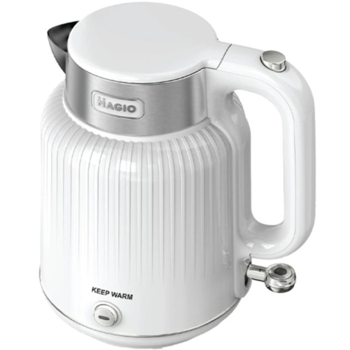 Електрочайник Magio MG-508 - це чудовий електричний чайник з корпусом з високоякісного пластику білого кольору. З потужністю 1250 Вт він швидко закип’ятить воду, при тому, що вміщує дана модель цілих 1,7 літрів, чого цілком достатньо для сім’ї. Індикатор рівня води дозволяє контролювати кількість води в чайнику. Для зручності він повертається на підставці на 360 градусів. Технічними перевагами електрочайника Magio є наявність фільтру від накипу, візуальний індикатор рівня рідини в приладі і опція автоматичного відключення після закипання. Чайник легко очищається за допомогою вологої губки або серветки.