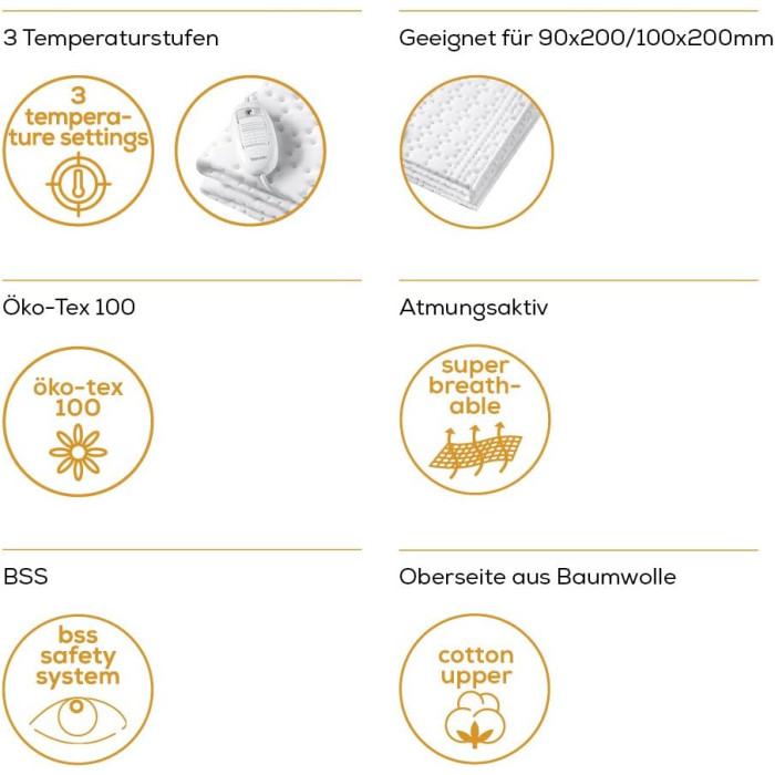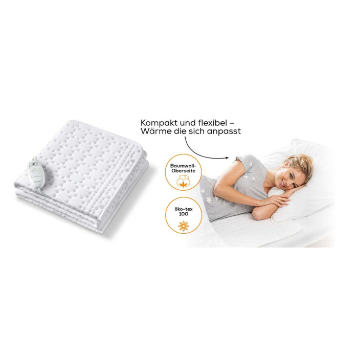 Електричне простирадло невеликого розміру. Розслаблює м'язи, покращує якість сну. Верхня сторона з бавовни, що дихає, низ – нетканий матеріал. Система безпеки Beurer (BSS) Відображення температури з підсвічуванням. Знімний перемикач. Матеріал верху: бавовна; матеріал підкладки: фліс.