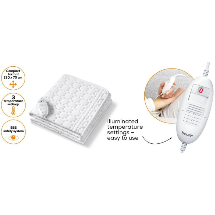 Електропростирадло Beurer, від мережі, 130х75см, 50Вт, 3 режими, бавовна, фліс, білий