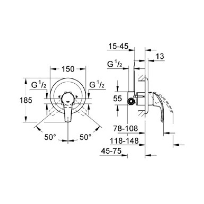 Змішувач для душу, одноважільний Для прихованого монтажу, включає: комплект верхньої монтажної частини, вбудований механізм; керамічний картридж, хром, регулювання витрати води, можливість встановлення мін. витрати 2,5 л/хв, металевий важіль, ущільнювач розетки та важеля, металева розетка, гвинтове кріплення, додатковий обмежувач температури