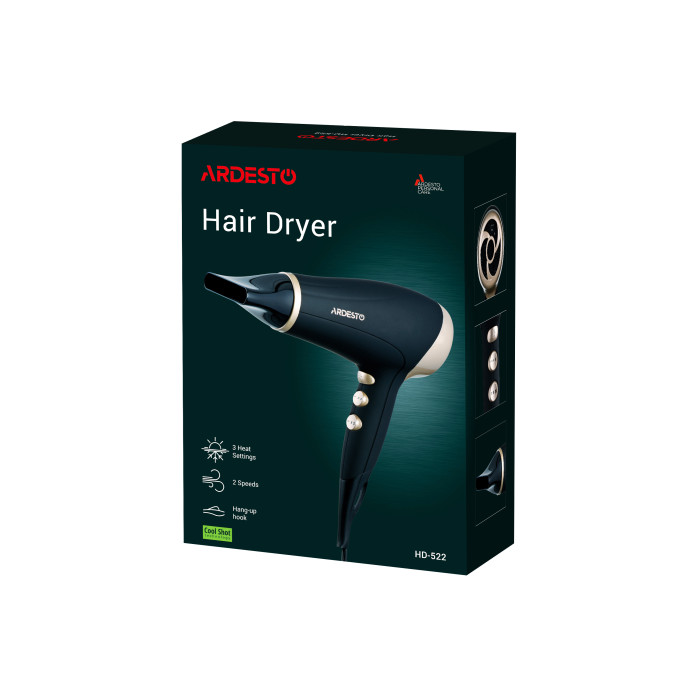 Фен ARDESTO Gemini HD-522, 1800-2200Вт, 2 швидкості, 3 темпер. режими , функція Cool Shot, чорний
