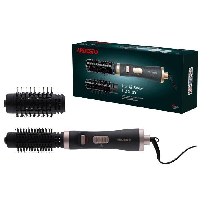 Фен-щітка ARDESTO – стайлер для укладання локонів, який одночасно сушить волосся, потужністю 1 000 Вт. Пристрій має два температурні режими. У комплектації передбачено дві знімні насадки з керамічним покриттям діаметром 40 і 50 мм, які обертаються за та проти часової стрілки. Додає зручності під час користування шнур живлення з обертанням на 360°. Аби стати власницею красивої укладки, не обов’язково відвідувати салон. Із феном-щіткою ARDESTO HD-C100 можна з легкістю робити зачіску самостійно.