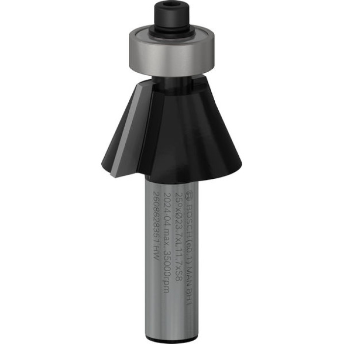 Фасочна фреза з хвостовиком 8 мм, шириною 5,5 мм, діаметром 23,7 мм, робочою довжиною 12 мм, загальною 54 мм, з кутом 25 градусів — робоча насадка для вертикального фрезера. Виготовлена з твердого сплаву, з двома лезами, шарикопідшипником фреза застосовується для зняття фасок та вибірки врівень з деталей з деревини та листових матеріалів, у тому числі з покриттям. Підходить для виготовлення тонких декоративних пазів на меблях. Шарикопідшипник дозволяє легко вести інструмент прямо по заготівлі без використання шаблону.