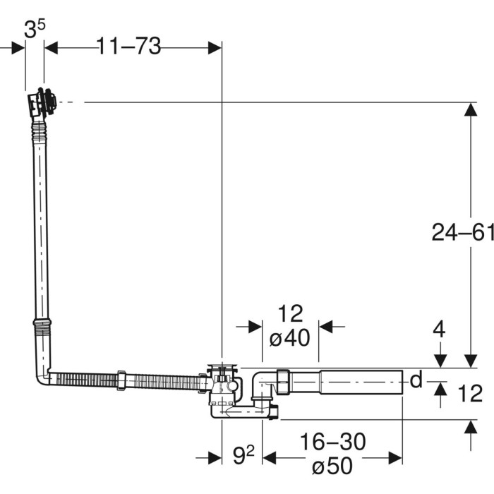 GEBERIT злив-перелив подовжений, з поворотною ручкою і кришкою зливного отвору, d52,довжина73см, хром глянс. 150.525.21.6