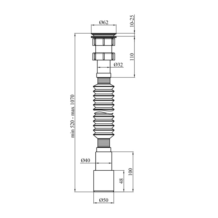 Діаметр випуску гофросифону становить 62 мм, що забезпечує відмінну продуктивність та ефективний відтік води. Для підключення до патрубка каналізації використовуються діаметри 40 і 50 мм, дозволяючи пристосувати гофросифон до різних систем водовідведення.