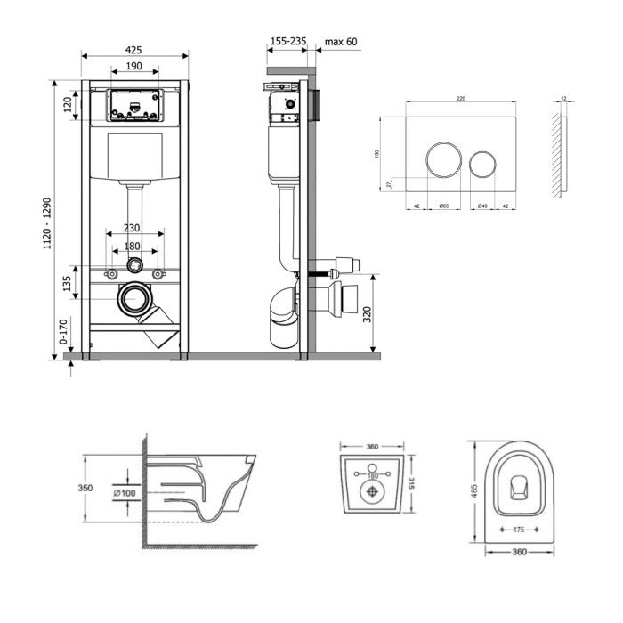 Унітаз: 350х360х520. Сидіння для унітазу: 35х367х455. Інсталяція: 1280х425х185. Панель змиву: 150х220х30.
