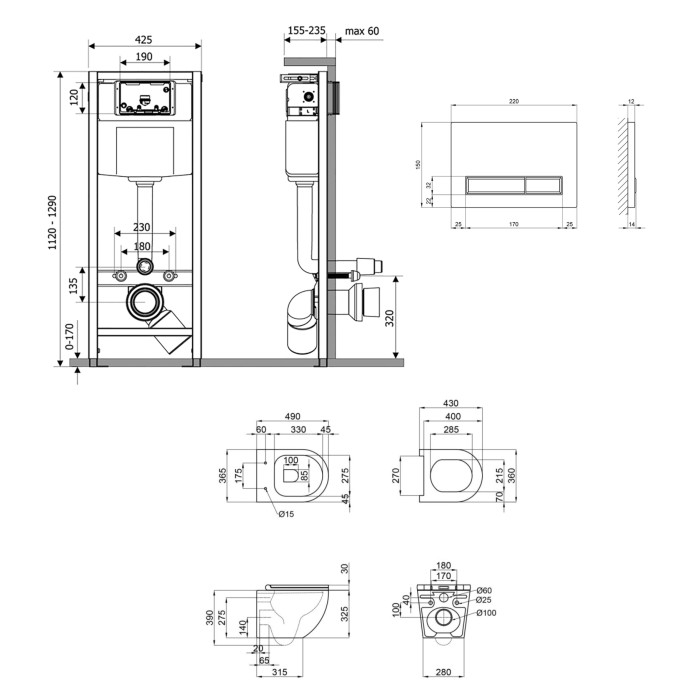 Унітаз: 390х365х490. Сидіння для унітазу: 30х360х430. Інсталяція: 1280х425х185. Панель змиву: 150х220х32.