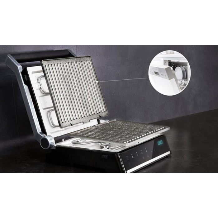 Гриль електричний CECOTEC Rock"nGrill Smart оснащений піддоном для збору жиру для максимально простого очищення після роботи. Робоча поверхня гриля розділена на 2 ребристі знімні пластини для смаження. Їх можна мити в посудомийній машині, що ще більше спрощує очищення після кожного використання.