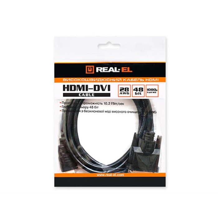 Кабель мультимедійний HDMI to DVI 1.8m REAL-EL (EL123500013) ідеально підійде для підключення Вашого ПК, DVD-плеєра, ноутбука до сучасного монітора або телевізора. Він виготовлений з добірних матеріалів з використанням мідних провідників товщиною 28AWG, щоб гарантувати широку смугу пропускання і забезпечити якісну передачу об'ємного зображення з семиканальним звуком.