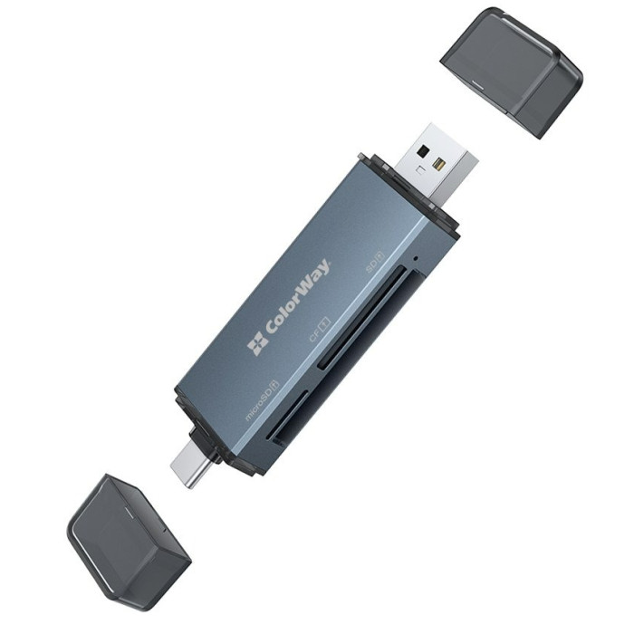 Кардрідер ColorWay 3-в-1 — компактний та стильний пристрій у формі брелока для зручного зчитування та запису даних з карт пам'яті. Оснащений одразу двома конекторами — USB-C та USB-A — що дозволяє підключати його до ноутбуків, ПК, планшетів і смартфонів із підтримкою OTG. Підтримує карти пам'яті форматів CF, SD та MicroSD (TF) обсягом до 2 ТБ.