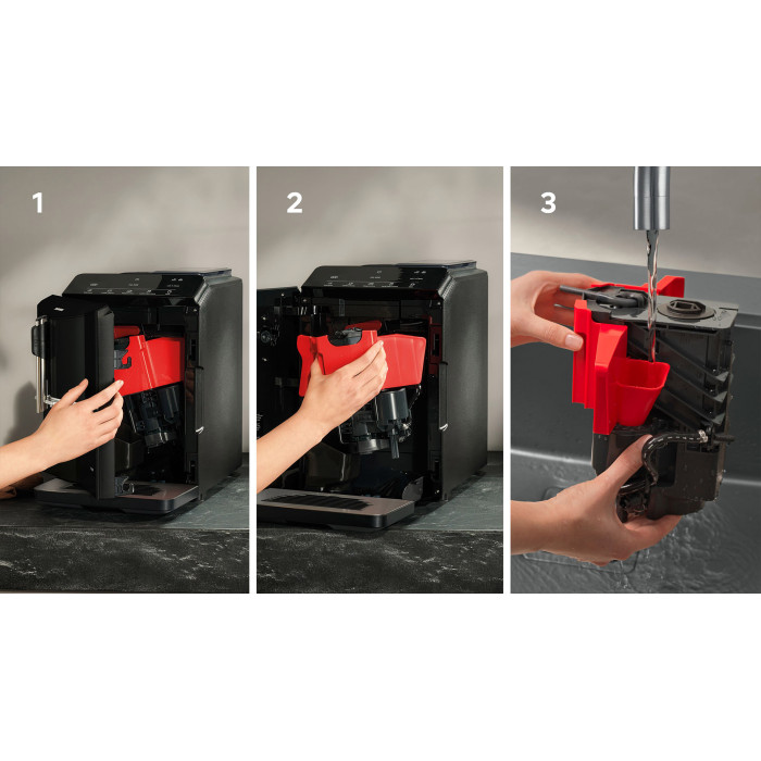 регулювання ступеня помелу/багаторівневий, деталі можна мити в посудомийній машині:/піддон для крапель, насадка для молока, конт. для кавової гущі, знімний заварювальний блок, система calc'nClean/автоматично очищає та видаляє накип, керамічний кавовий мли