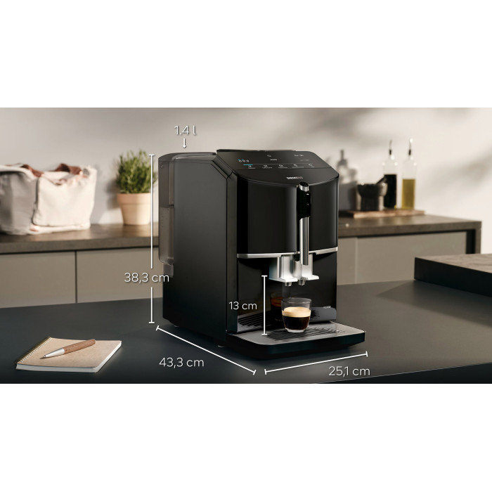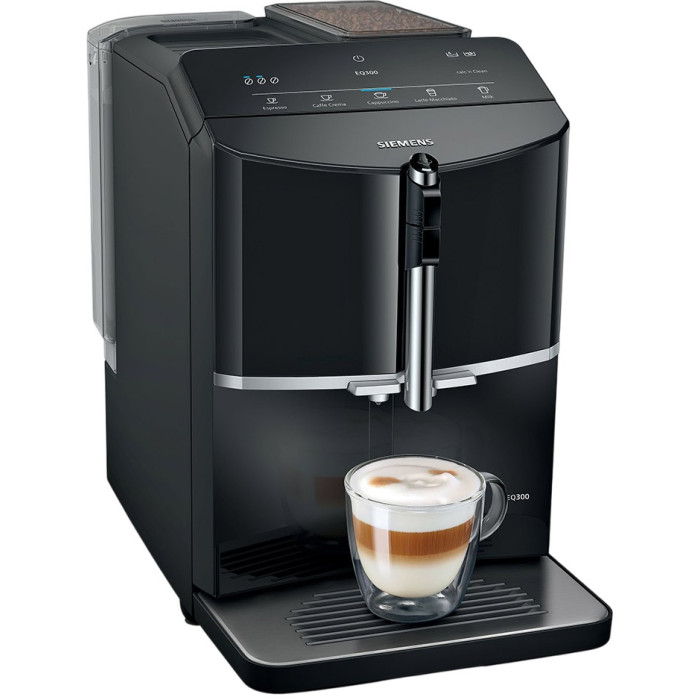 Кавомашина Siemens TF301E19 з функцією oneTouch готує еспресо, капучино, лате-мак’ято та каву одним натисканням. Оснащена керамічним млинком, насосом 15 бар і регульованим соплом (до 13 см). Має знімний резервуар (1.4 л) та автоматичну систему очищення calc'nClean. Капучинатор, піддон і контейнер для гущі можна мити в посудомийній машині. Багаторівневе регулювання помелу, потужність 1300 Вт, сумісність із фільтром BRITA Intenza. Siemens TF301E19 – ідеальне рішення для швидкого приготування улюблених кавових напоїв.