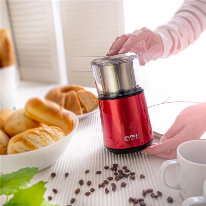 З цією практичною кавомолкою швидко і легко молоти і подрібнювати кавові зерна, а також злаки, трави чи горіхи. Незалежно від того, чи Ви хочете випити свіжомеленого еспресо або подрібнити горіхи: прилад працює на потужному, повністю автоматичному рівні потужності 200 Вт і управляється за допомогою кнопки включення. Компактний розмір та сучасний дизайн кухонного пристрою дозволяють легко зберігати його на вашій кухні.