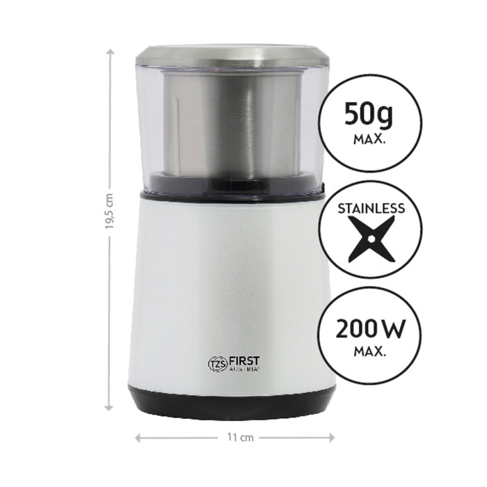 З цією практичною кавомолкою швидко і легко молоти і подрібнювати кавові зерна, а також злаки, трави чи горіхи. Незалежно від того, чи ви хочете випити свіжомеленого еспресо або подрібнити горіхи: прилад працює на потужному, повністю автоматичному рівні потужності 200 Вт і управляється за допомогою кнопки включення. Компактний розмір та сучасний дизайн кухонного пристрою дозволяють легко зберігати його на вашій кухні.