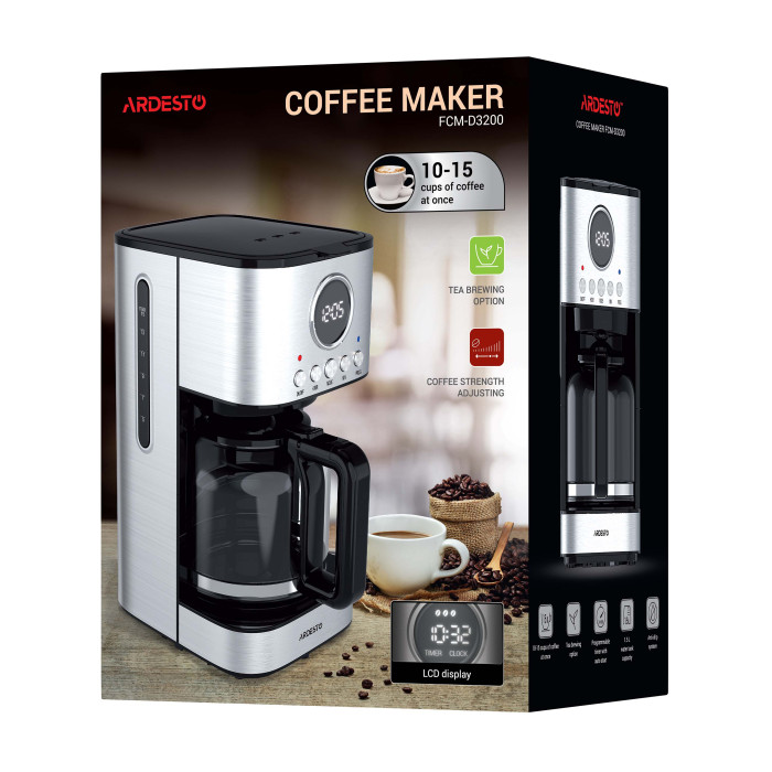 Крапельна кавоварка Ardesto Ardesto FCM-D3200. Крапельна кавоварка потужністю 900 Вт для використання в побутових та аналогічних побутовим умовах: магазинах, офісах, готелях тощо. Кавник об’ємом 1,5 л виготовлено зі стійкого до високих і низьких температур боросилікатного скла. Пристрій має зручне керування, оснащений стильним дисплеєм із білим підсвічуванням, знімним фільтром, що можна мити, та антикрапельною системою.