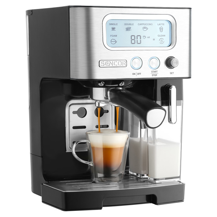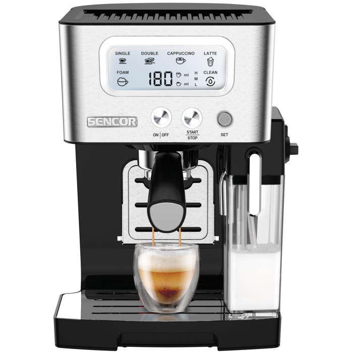 Кавоварка Sencor ріжкова 1.4л, мелена, автоматичний капучинатор, LCD-дисплей, нерж. сталь-чорний