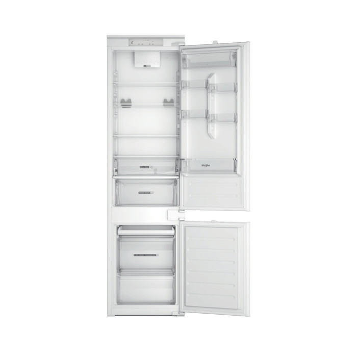 Вбудований холодильник Whirlpool WHC20D023B1SF працює тихо — до 34 дБ(А). Технологія 6th SENSE автоматично регулює температуру й вологість для довшої свіжості продуктів. Усередині — міцні скляні полиці з регулюванням по висоті та ящик для фруктів і овочів з оптимальною вологістю. Нижня морозильна камера має кілька висувних шухляд для зручної організації. LessFrost зменшує утворення інею, а Stop Frost допомагає уникати наростів льоду та спрощує догляд.