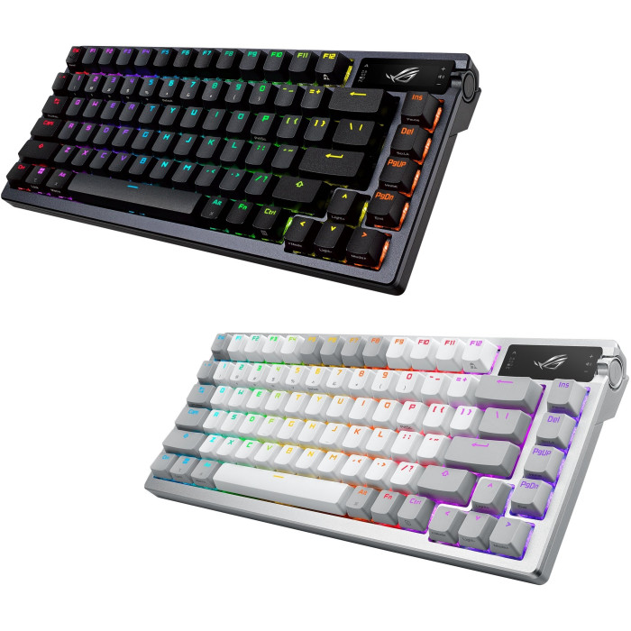 Геймерська клавіатура ROG Azoth: можливість персоналізації, формфактор 75%, пружна прокладка у кріпленні верхньої металевої пластини, три демпфувальних шари, попередньо змащені механічні перемикачі ROG NX з можливістю гарячої заміни, стабілізатори клавіш, двокомпонентні PBT-ковпачки, набір для змащування, три режими підключення, технологія SpeedNova у режимі 2,4 ГГц, OLED-дисплей, 3-позиційний регулятор, три кути нахилу, підтримка Mac.
