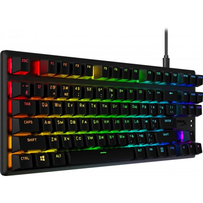 Ультракомпактна, міцна безклавішна клавіатура, оснащена спеціальними механічними перемикачами HyperX, розробленими для того, щоб дати геймерам найкраще поєднання стилю, продуктивності та надійності. Довговічність клавіатури PBT підвищується завдяки попередньо встановленим кришкам клавіш з бічним друком. Механічні перемикачі клавіш HyperX виготовлені з відкритими світлодіодами, тому більша частина світлового потоку видима, забезпечуючи більш яскраве, приголомшливе освітлення.