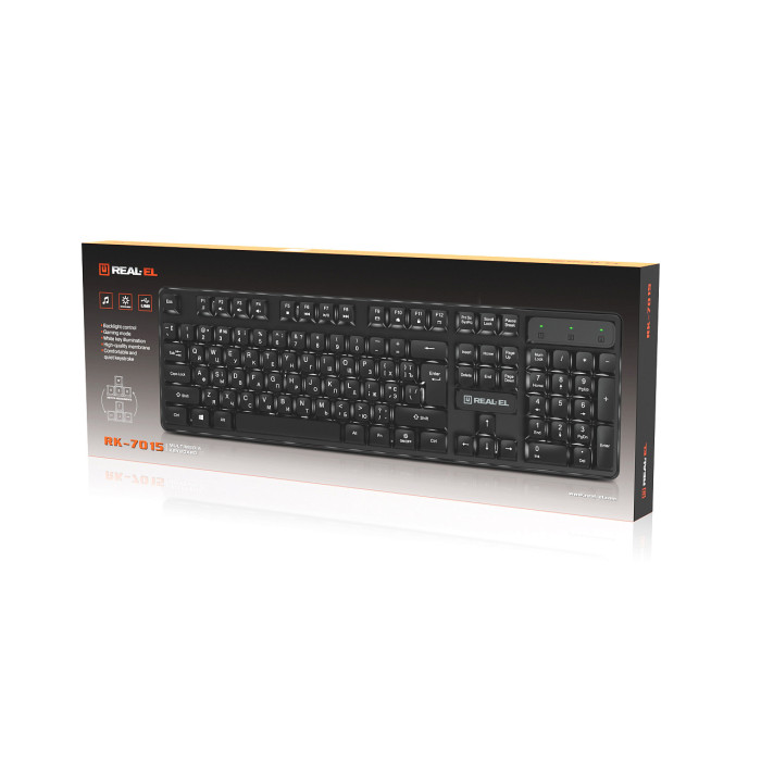 Мультимедійна клавіатура REAL-EL RK-7015 - це стильна, зручна та доступна клавіатура, призначена для комфортної роботи та розваг. Вона має ергономічний дизайн, що забезпечує зручність при тривалому використанні. Завдяки високоякісній мембрані клавіші мають плавний хід і витримують понад 20 мільйонів натискань. Підключення здійснюється через USB, а функціональні комбінації з клавішею Fn дозволяють швидко керувати мультимедіа, інтернетом та додатками.