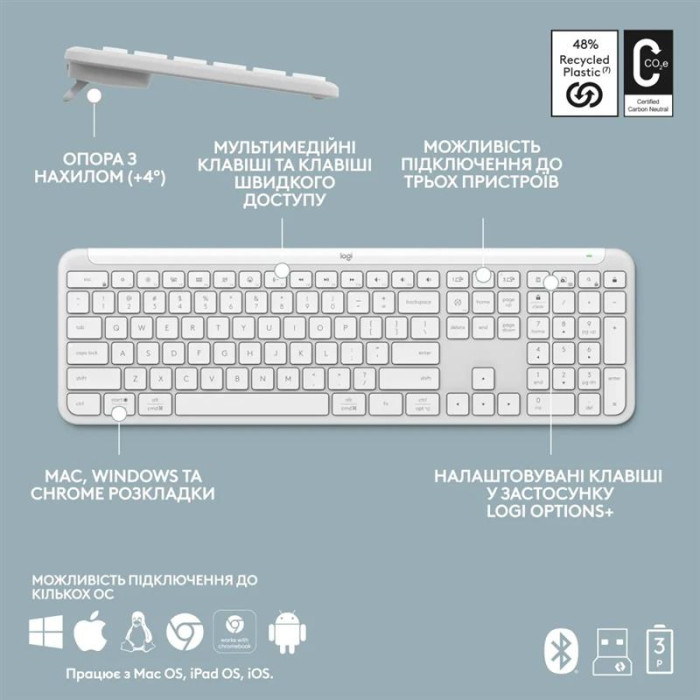 Клавіатура Signature Slim легко підключається до будь-якої платформи через бездротовий зв’язок, незалежно від операційної системи вашого пристрою. Вона підтримує підключення до Windows, macOS, ChromeOS, Linux, iPadOS, iOS та Android, що робить її універсальним інструментом для всіх ваших потреб.