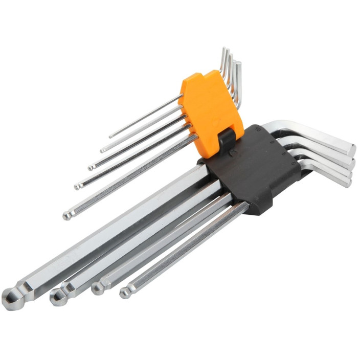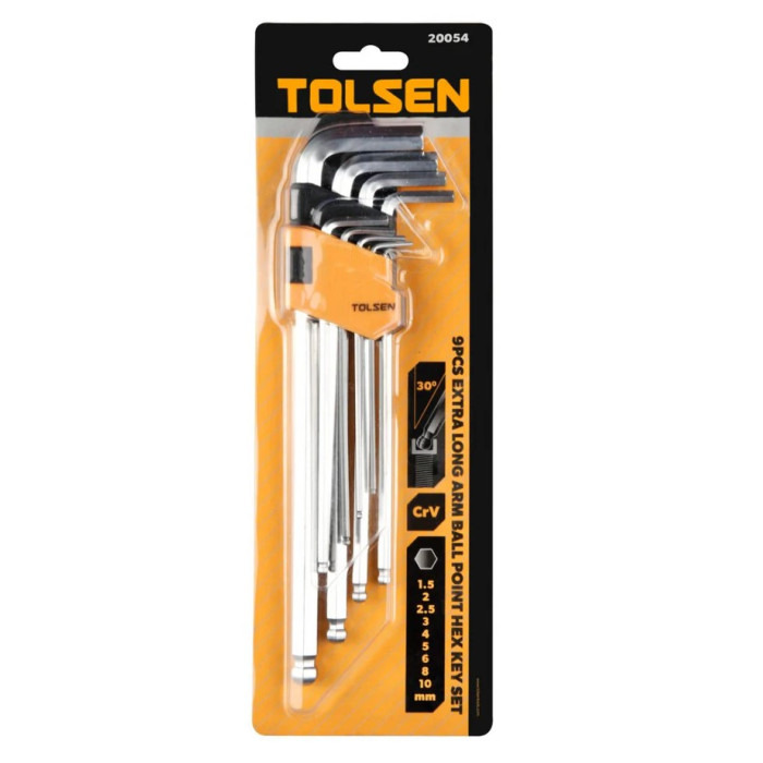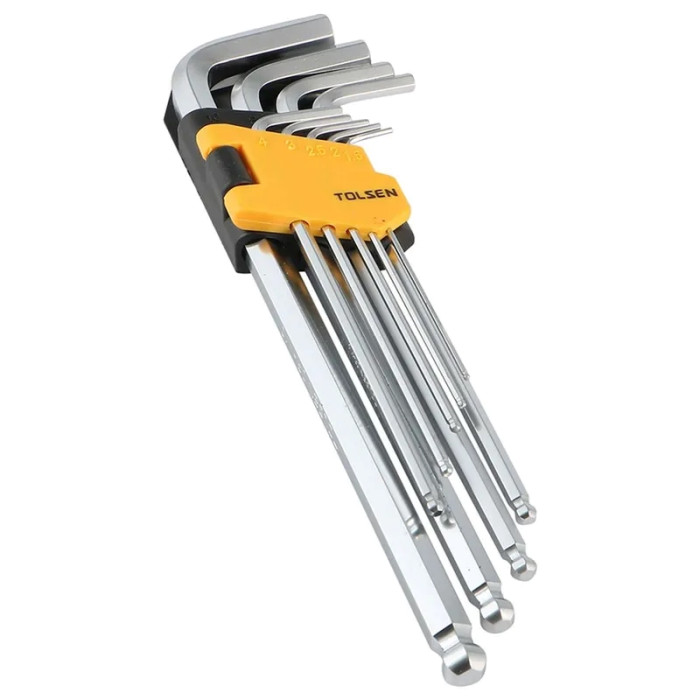 Комплект з 9-ти подовжених шестигранних закруглених ключів Tolsen різного розміру призначений для закручування/відкручування кріпильних елементів (гвинтів, гайок, шурупів) з внутрішнім шестигранником в перетині. Підходить для майстрів будь-якої галузі.