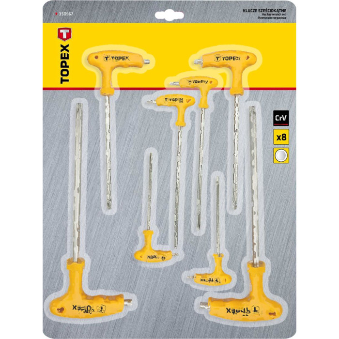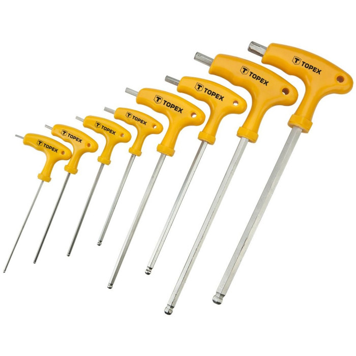 Ключі шестигранні Т-подібні TOPEX, виготовлені з міцної хромванадієвої сталі, що забезпечує подовжений ресурс продукту. Кожен із восьми ключів, що входять до складу набору, має пластикову ручку ергономічної форми. Марка TOPEX адресована майстрам, які займаються дрібним ремонтом.