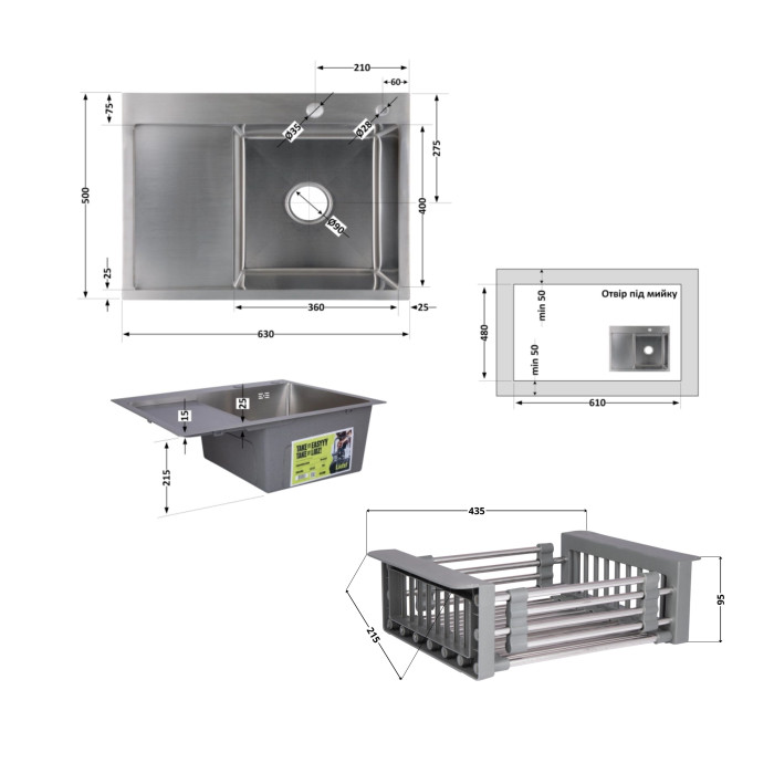 Нержавіюча сталь - мийка; нержавіюча сталь / пластик - кошик