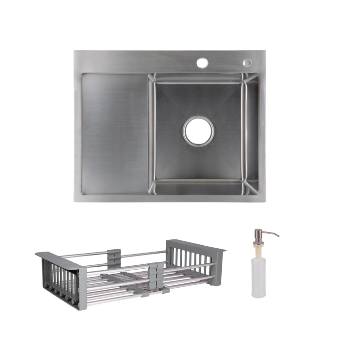 Комплект Lidz Handmade H6350L Мийка для кухні інтегрована крило зліва Brushed у комплекті з дозатором + Lidz K01G Корзина для кухонної мийки