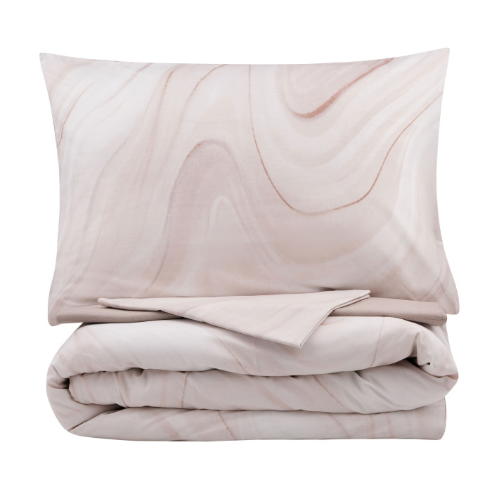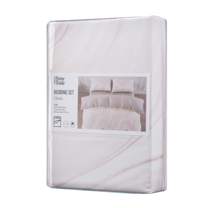 Комплект постільної білизни Gloria – це поєднання витонченого дизайну й безкомпромісної якості. Вироблена зі 100 % бавовняного сатину щільністю 200 ТС, постіль подарує винятковий комфорт і затишок. М’яка тканина ніжно пестить шкіру, забезпечуючи її дихання і створюючи відчуття свіжості та легкості. Дизайн із вишуканим мармуровим візерунком у бежевих відтінках додає спальному місцю елегантності та спокою.