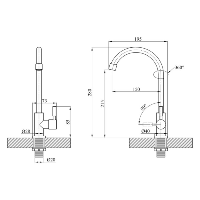 Кран призначений для врізного монтажу, що забезпечує зручне та міцне з'єднання з поверхнею. Тип виливу – поворотний, що збільшує функціональність крана.