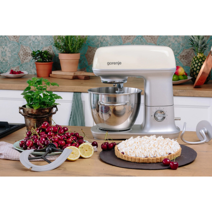 Кухонна машина Gorenje потужністю 1000 Вт оснащена металевим корпусом і чашею об'ємом 4,5 л з ручкою. Завдяки 3D-змішуванню та 7 швидкостям із плавним запуском забезпечує рівномірне змішування. У комплекті 4 насадки: гак для тіста, віничок, лопатка й силіконова насадка. Має захист від перегріву, кришку з отвором для інгредієнтів і стабільні гумові ніжки.
