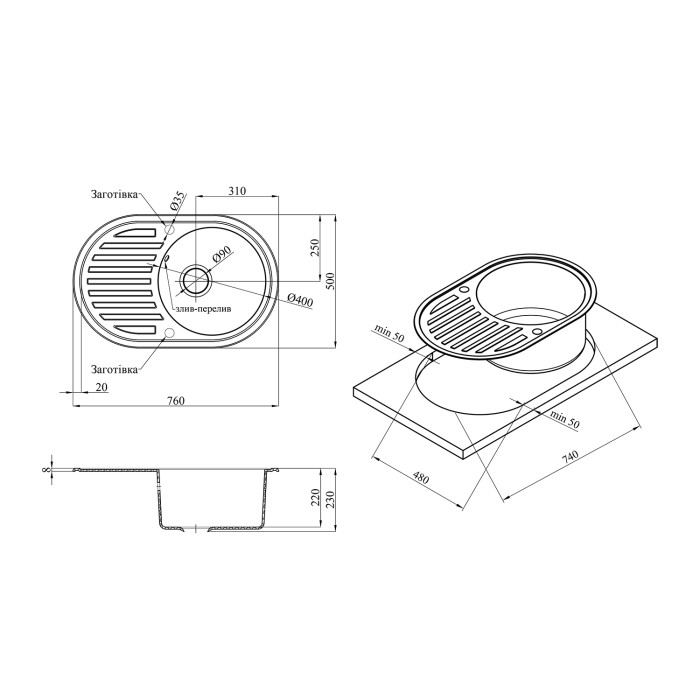 Мийка, сифон, злив-перелив, кошиковий вентиль, кріплення.