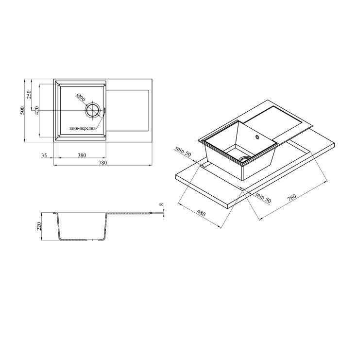 Мийка, сіфон, кріплення