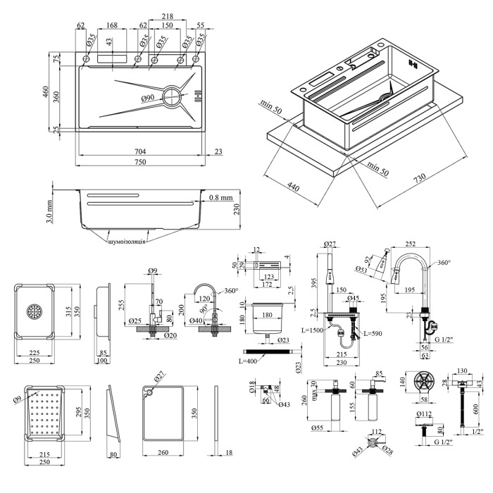 Мийка Kroner KRP Schwarze - SET7545NB PVD комплектується всім необхідним для максимального комфорту: