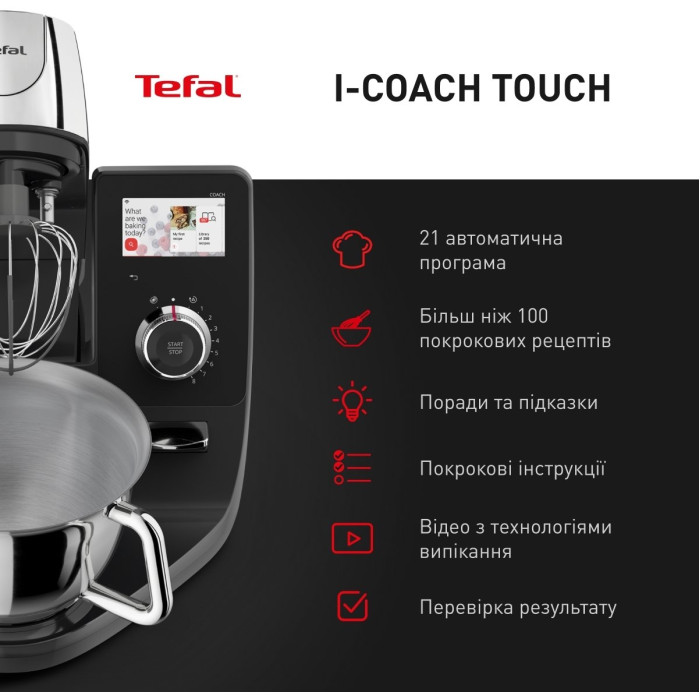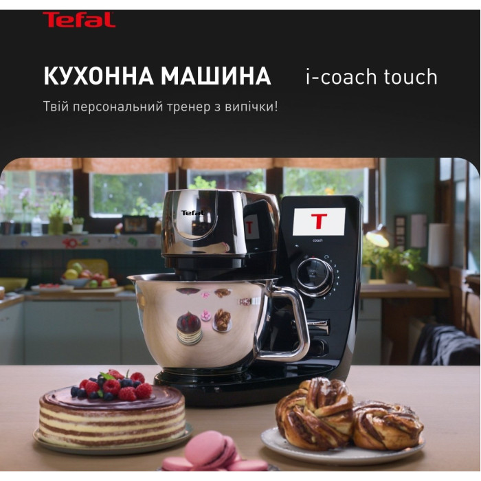 Незалежно від того, чи ви тільки починаєте займатися випічкою, чи вже досвідчений професіонал, Tefal i-Coach Touch є ключем до великої різноманітності успішних рецептів день за днем. Відкрийте для себе якісну та інноваційну кухонну машину, яку може надати тільки Tefal: 21 автоматична програма, покрокові рецепти, навчальні посібники та інструктаж на інтуїтивно зрозумілому сенсорному екрані 4,3 дюйма, нескінченні рецепти зі щомісячними оновленнями безпосередньо на приладі та через підключену програму, і зручні підключені кухонні ваги для завершення комплекту.
