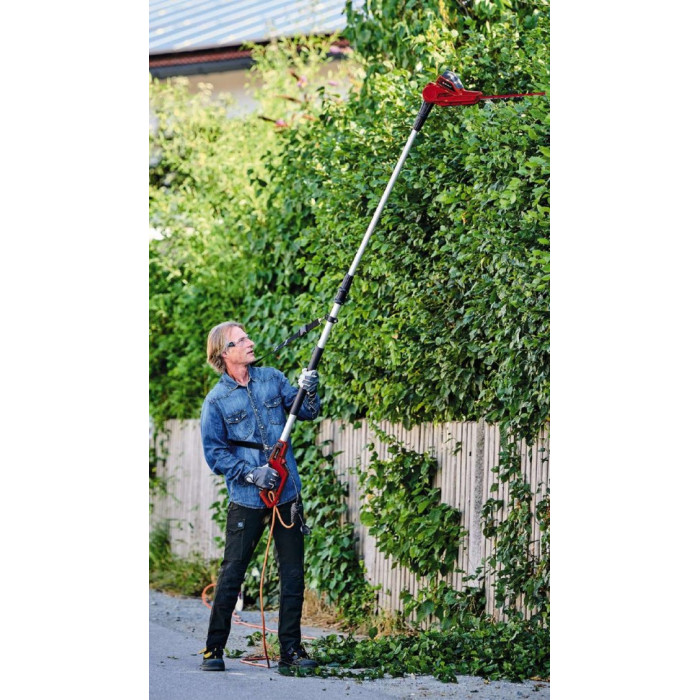 Електричний кущоріз телескопічний Einhell GC-HH 5056 потужністю 500 Вт є дуже ефективним інструментом, який забезпечує гарне обрізання високих живоплотів, чагарників та кущів завдяки ручці, яку можна висунути до 250 см. Рухливі у протилежних напрямках двоклинкові леза виготовлені з обробленої лазером та заточені алмазом сталі з відстанню між зубцями 20 см, довжиною леза 56 см і довжиною різу 47 см, ріжуть товсті гілки без проблем та забезпечують чисті результати різу.