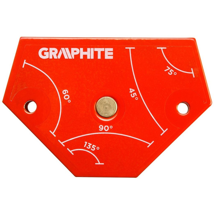 Кутник (косинець) для зварювальних робіт GRAPHITE (арт. 56H904) уможливлює скріплення зварюваних елементів під кутом 45˚, 60˚, 75˚, 90˚ або 135˚. Потужні феритові магніти притримувані елементи, завдяки чому зварник має дві вільні руки.