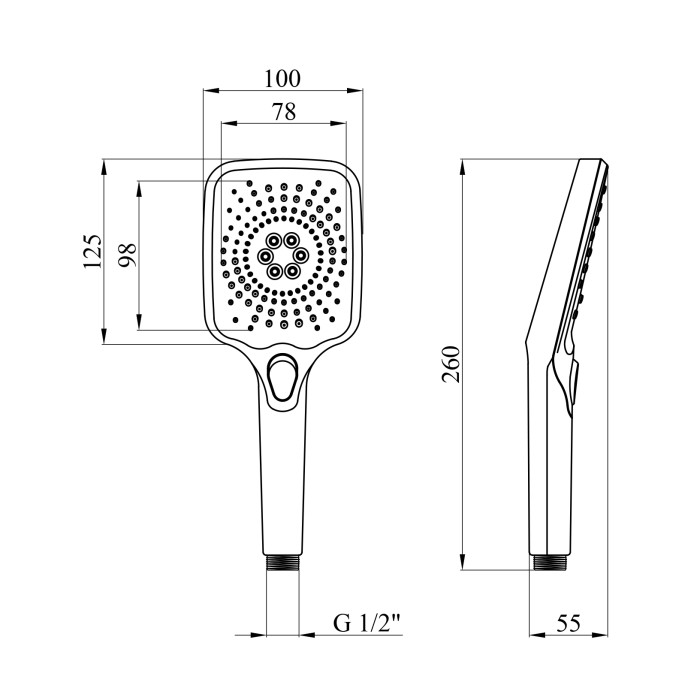 ABS-пластик з двошаровим нікель-хромовим покриттям, підключення 1/2", форма прямокутна.