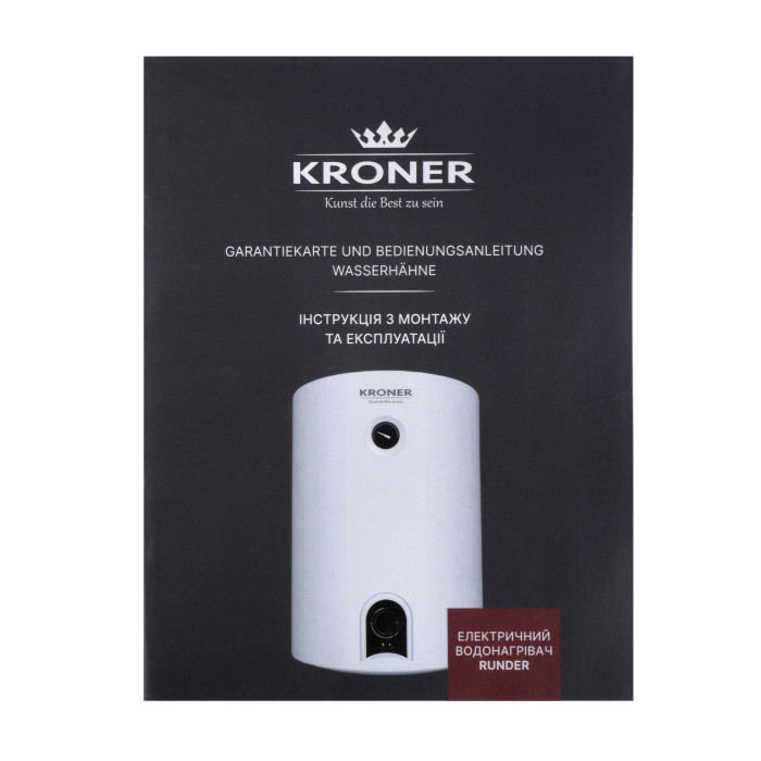 Мануал для бойлера Kroner 33344550 Runder (мокрий ТЕН) — це посібник користувача, в якому міститься інформація щодо встановлення, підключення, експлуатації та обслуговування водонагрівача.