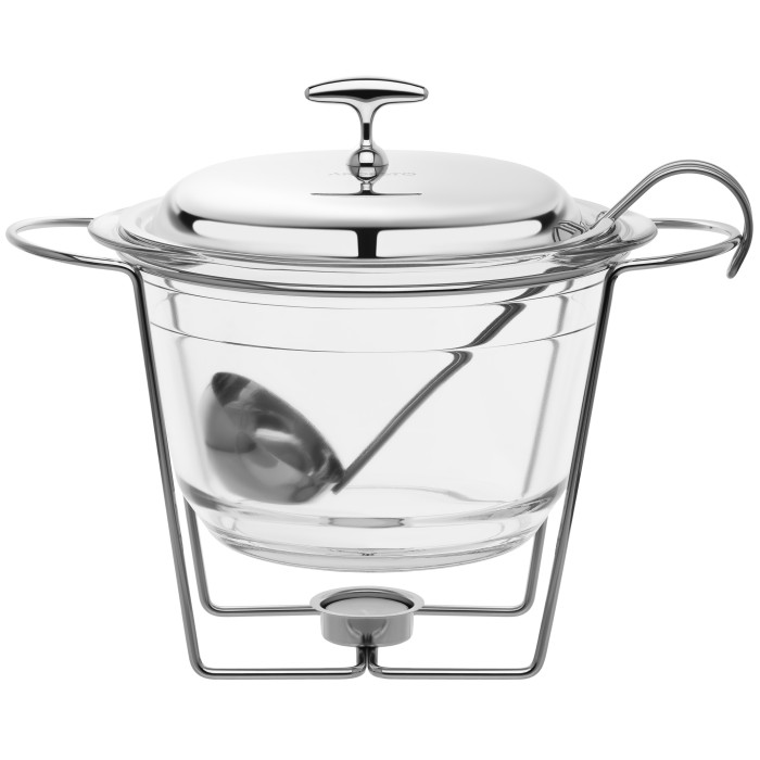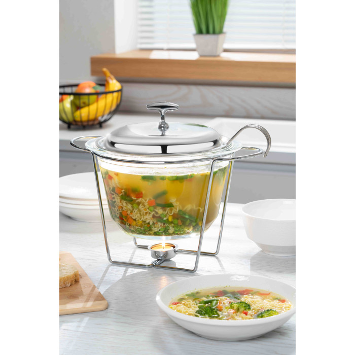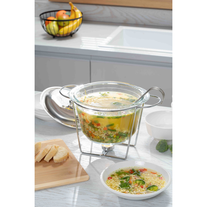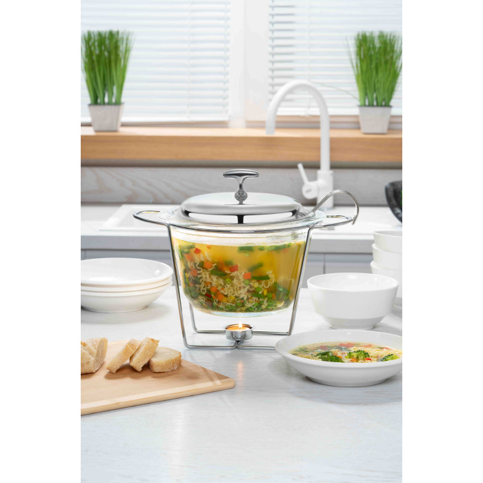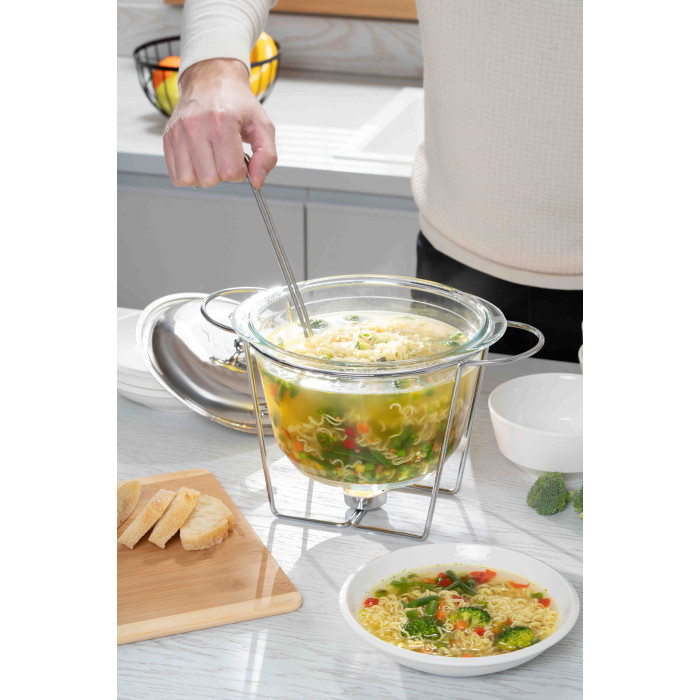 Круглий марміт об’ємом 3,8 л – це елегантне поєднання функціональності та стилю, створене для зручного сервірування гарячих страв. Ємність виготовлено з термостійкого боросилікатного скла, яке витримує температури від -40 до +400 °C, даючи змогу використовувати її в мікрохвильовій печі та духовці. Прозорий колір додає вишуканості, а кришка, підставка та ополоник із нержавіючої сталі забезпечують довговічність і зручність щодо користування. У комплекті також передбачено свічку для підтримання тепла, а всі елементи можна мити в посудомийній машині, що робить догляд максимально простим.