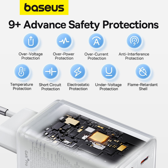 Зарядний пристрій Baseus Wall Charger GaN6 Pro 2хUSB-C+2xUSB 65W, разом з кабелем Type-C to Type-C, стає невід'ємним елементом для швидкої та ефективної зарядки широкого спектру пристроїв – від смартфонів до ноутбуків. Використовуючи передову технологію GaN (галій-нітрид), цей пристрій пропонує покращену продуктивність зарядки, при цьому мінімізуючи розміри, тепловиділення та споживання енергії. Завдяки швидкій зарядці ноутбука потужністю 65 Вт, цей пристрій стає незамінним помічником для тих, хто цінує час та продуктивність своєї роботи.ТЕХНОЛОГІЯ GAN6Завдяки передовій технології GaN6 цей настінний зарядний пристрій з подвійним USB-C забезпечує більш високий рівень енергоефективності та зберігає низьку температуру. Воно успішно вирішує проблему постійної перезарядки, гарантуючи швидке та безпечне заряджання пристроїв.4-ПОРТОВА ОДНОЧАСНА ЗАРЯДКА ДЛЯ КІЛЬКОХ ПРИСТРОЇВЦей зарядний пристрій потужністю 65 Вт має унікальну можливість одночасної зарядки, завдяки якій можна заряджати до 4 пристроїв одночасно. Його можна використовувати для заряджання різних типів пристроїв: від розумного годинника і смартфонів до ноутбуків. Ця універсальність робить його ідеальним супутником як удома, так і у подорожах.НА 35 % МЕНШИЙЗарядний пристрій потужністю 65 Вт на 35 % менший за розмірами і більш компактний, ніж звичайний зарядний пристрій USB типу C потужністю 65 Вт. Ви можете легко носити цей зарядний пристрій Baseus з собою, щоб швидко зарядитися під час поїздок або в дорозі.ФУНКЦІЇ ЗАХИСТУБезпека користувача має першорядне значення, тому Baseus GaN6 Pro оснащений рядом захисних функцій, включаючи захист від перенапруги, короткого замикання та високих температур. Це гарантує, що користувачі можуть довіряти своїм пристроям навіть у разі використання зарядного пристрою на максимальній вихідній потужності.ОСОБЛИВОСТІ:− Висока потужність 65 Вт дозволяє заряджати пристрої високої потужності, включаючи ноутбуки, планшети та смартфони;