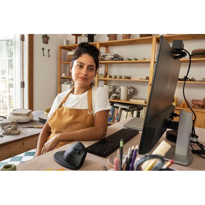 HP 920 Ergonomic Vertical Mouse (6H1A4AA) — інноваційна миша для комфортної та продуктивної роботи. Вона має вертикальний дизайн, що забезпечує природне положення руки та знижує напруження м’язів на 12%. Підключення можливе через USB-A, Bluetooth 5.3 або бездротовий донгл, дозволяючи одночасно працювати з трьома пристроями. Миша оснащена сенсором для роботи на різних поверхнях, п’ятьма програмованими кнопками та батареєю, яка працює до 16 тижнів на одному заряді. Знімна підставка для зап’ястя додає додатковий комфорт. Корпус виготовлений із 65% переробленого пластику